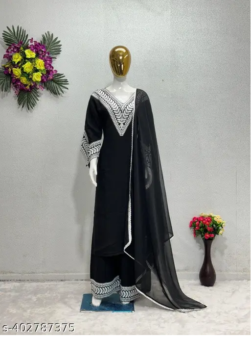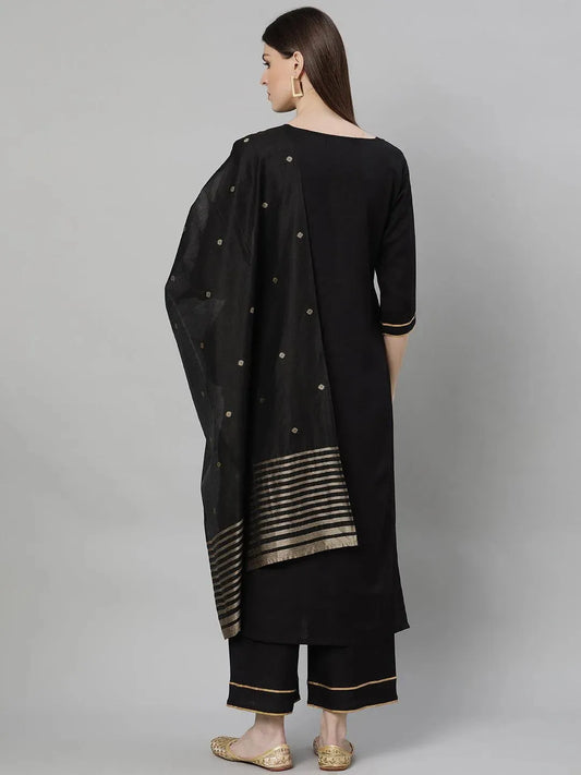 Black Solid Cotton Straight Kurta With Palazzos & Dupatta