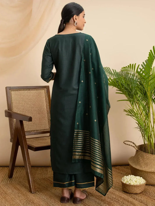 Green Solid Cotton Straight Kurta With Palazzos & Dupatta